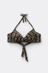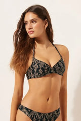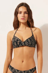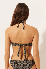Non-wired fixed triangle bikini top with graduated padded cups for a volume effect. Fabric with gold laminated ethnic patterns on a black background, with a fashionable and contemporary style. The shoulder straps can be hooked onto the back band or tied around the neck, and the back bow fastening provides a versatile fit.