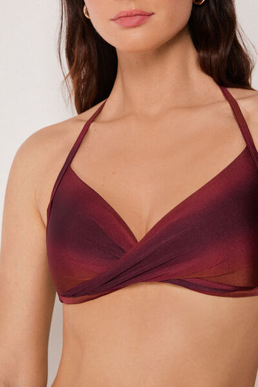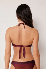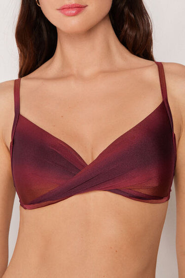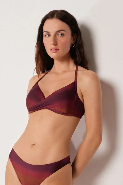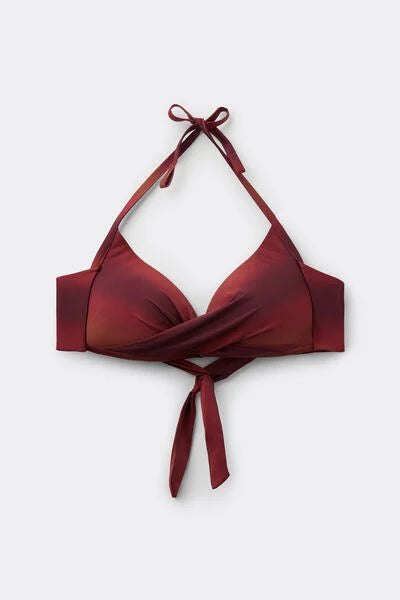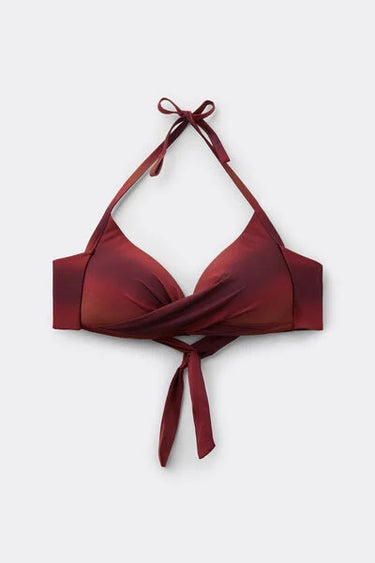 Non-wired fixed triangle bikini top with graduated padded cups for a volume effect. Made from soft, ombré microfibre with a sophisticated allure, for an elegant, contemporary look. The shoulder straps can be hooked onto the back band or tied around the neck, and the back bow fastening provides a versatile fit.