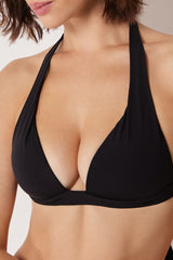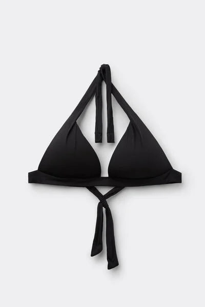 Non-wired fixed triangle bikini top with graduated padded cups that add volume to enhance the cleavage. The super-soft fabric is pleasant to wear and light and comfortable on the skin. The shoulder straps have eyelets on the ends so they can be hooked onto the back band or tied around the neck. Back bow fastening.