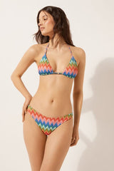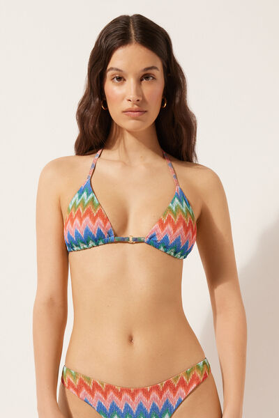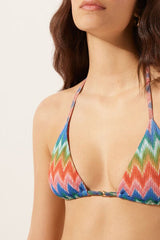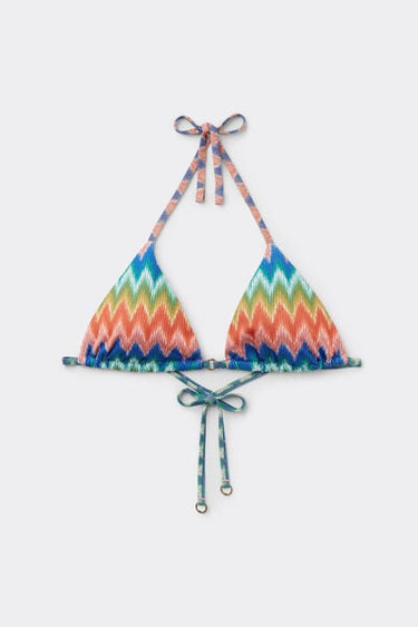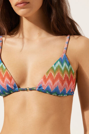Slide triangle bikini top with removable padding and no underwire for a natural effect. A dynamic and sophisticated chevron pattern in bright colours on slightly crinkled fabric, perfect for a modern, refined look. The shoulder straps have eyelets on the ends so they can be hooked onto the back band or tied around the neck. Thin tie fastening at the back.