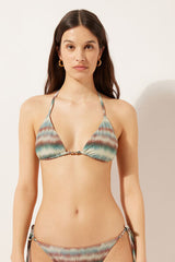 Slide triangle bikini top with removable padding and no underwire for a natural effect. Bright, dégradé tie-dye pattern embellished with glittery details on a soft and shiny fabric, ideal for a vibrant, original look. The shoulder straps have eyelets on the ends so they can be hooked onto the back band or tied around the neck. Thin tie fastening at the back.