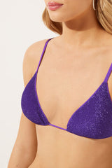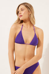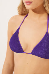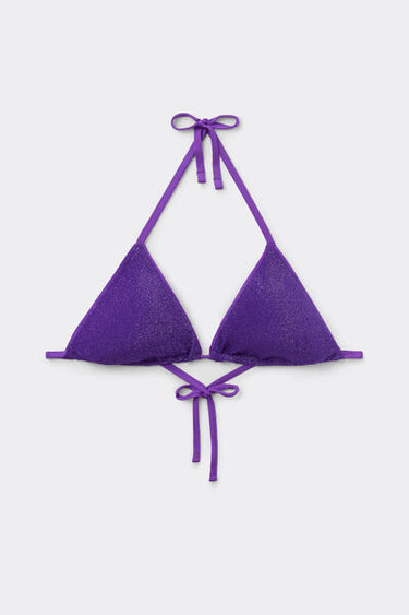 Slide triangle bikini top with removable padding and no underwire for a natural effect. Made from refined shiny lamé fabric offering a bright and sophisticated effect. The shoulder straps have eyelets on the ends so they can be hooked onto the back band or tied around the neck. Thin tie fastening at the back.