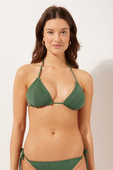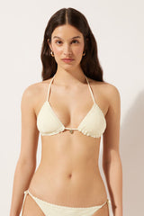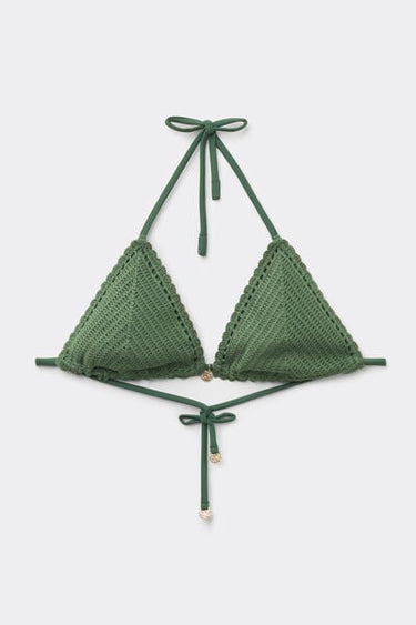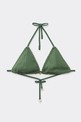 Slide triangle bikini top with removable padding and no underwire for a natural effect. The refined and sophisticated crochet fabric is embellished with a tag at the centre-bust that enhances its elegance. The shoulder straps have eyelets on the ends so they can be hooked onto the back band or tied around the neck. Thin tie fastening at the back.
