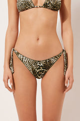 Brazilian bikini bottoms with bow fastening at the hips to adjust the fit. Thanks to the slightly rounded waist, they can be worn with a regular fit or with a higher leg to enhance your figure. A foliage pattern reminiscent of an animal print style combines exotic leaf motifs with the typical stripe patterns of the animal world. With a central seam at the back to ensure a better fit.