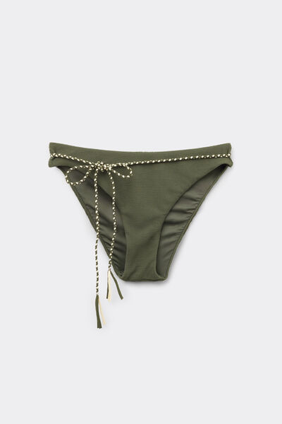 Fully lined bikini bottoms with invisible seams for a smooth shape. The rounded waist at the front allows for wear with classic coverage or a higher leg, depending on your body shape. The 3D-effect crinkle fabric, embellished with a woven drawcord, combines elegance, comfort and freshness for a distinctive and modern look.