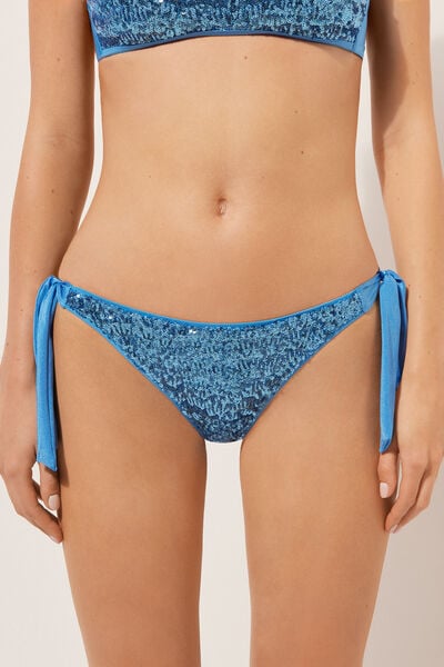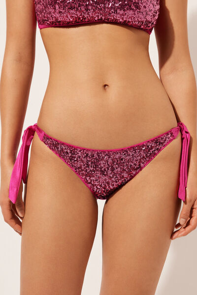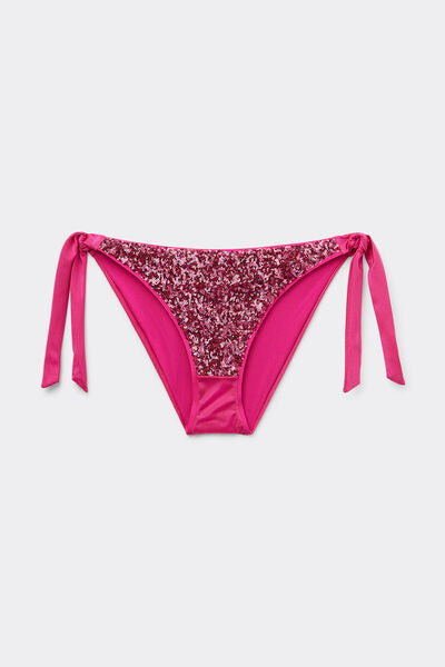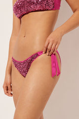Bikini bottoms with bow fastening at the hips to adjust the fit. The slightly rounded waist at the front allows for wear with classic coverage or a higher leg, depending on your body shape. The shine microfibre fabric is embellished with elegant sequins. Fully lined with invisible seams.