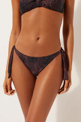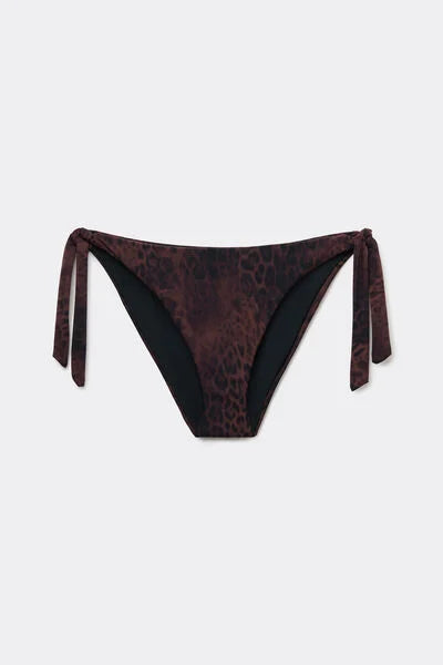 Bikini briefs with side tie fastenings for adjustable fit. Leopard print in dark brown and black tones for a bold and sophisticated style. The slightly curved waist allows them to be worn either in a regular or high-leg style to flatter the figure. Fully lined with invisible seams.