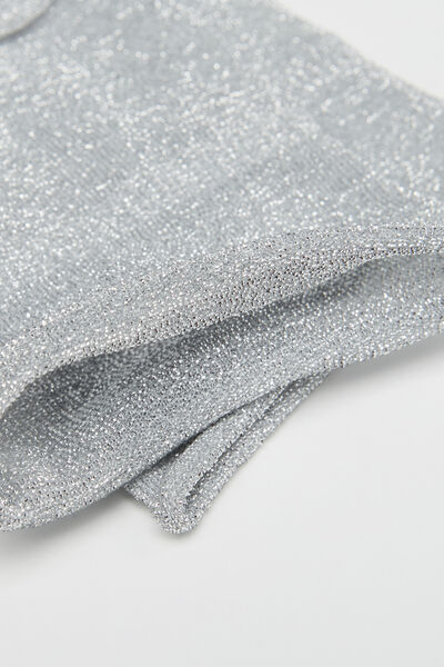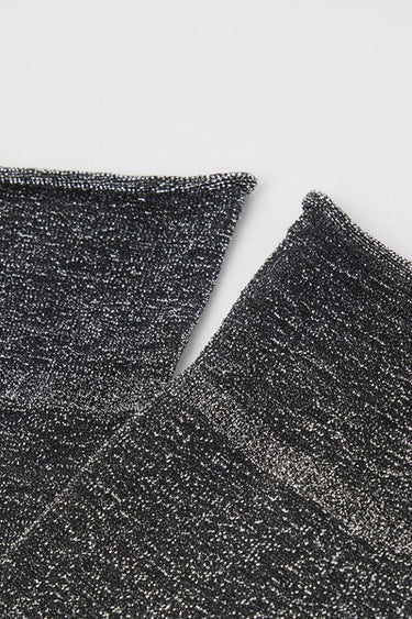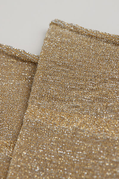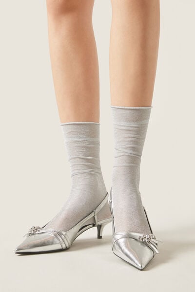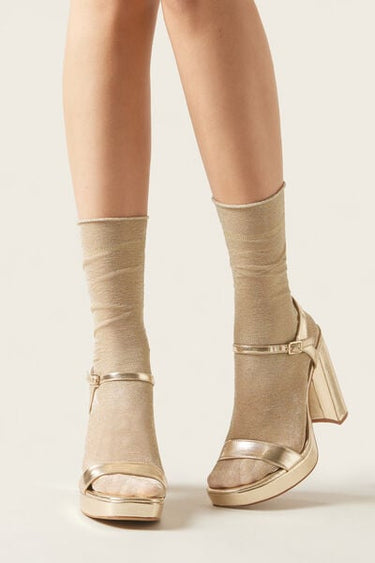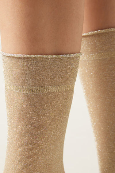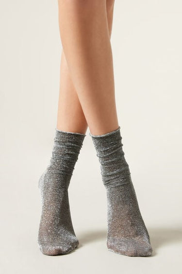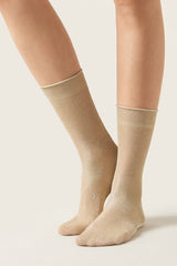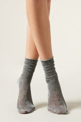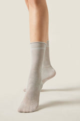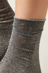 Women’s 50 denier opaque short socks with glitter, slightly longer on the ankle, with raw-cut edge.