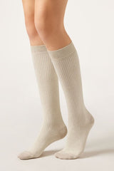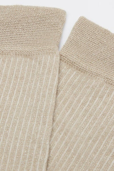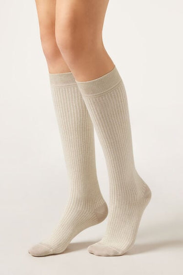 Women's long ribbed socks with glittery thread. This design adds a touch of sparkle and style to your outfit, guaranteeing optimal comfort and fit for wearing on various occasions.
