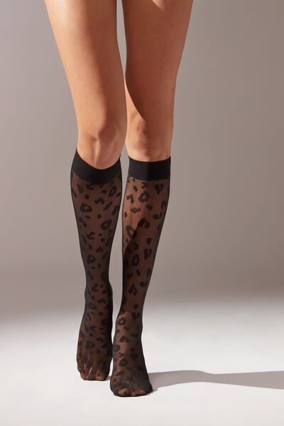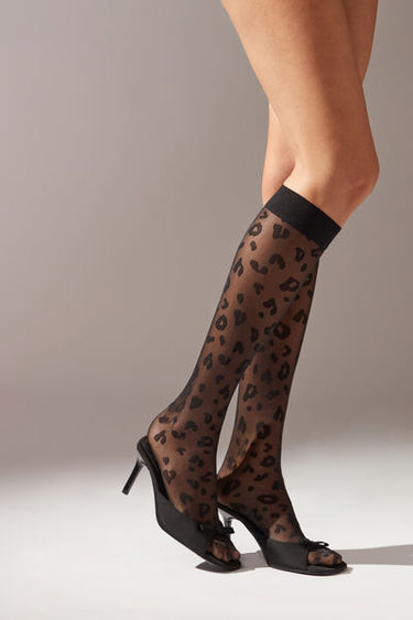 Women’s 30 denier sheer knee-high socks with an animal print pattern. Handy plain edge.