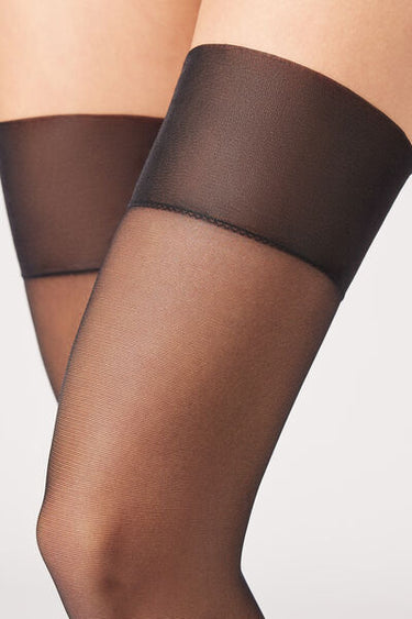 20 denier sheer garter belt-effect socks with invisible toe and new sheer edge.