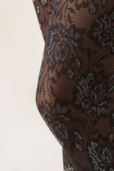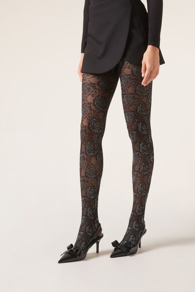 Women's 60 denier tulle tights with invisible cotton gusset, featuring a floral pattern and silver glitter.