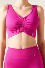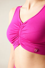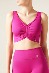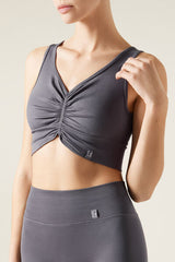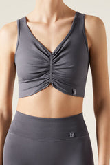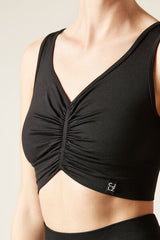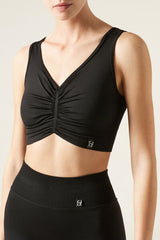 Sleeveless V-neck top with wide shoulder straps, embellished with elegant ruching at the centre-bust. Made from a soft and stretchy fabric, it offers the perfect balance of comfort and style. Ideal for training or to complete a casual look. Perfect for pairing with leggings MODP1252 and other fitness styles.